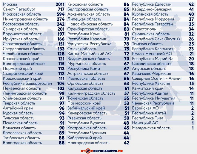 Из субъектов Федерации по числу заболевших за сутки выделяются Санкт-Петербург (717 случаев), Московская область (594), Нижегородская область (274), Ростовская область (242), Самарская область (201), Воронежская область (197), Иркутская область (166).