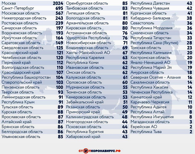Из субъектов Федерации по числу заболевших за сутки выделяются Санкт-Петербург (695 случаев), Московская область (567), Нижегородская область (243), Ростовская область (239), Самарская область (197), Воронежская область (193), Иркутская область (164).