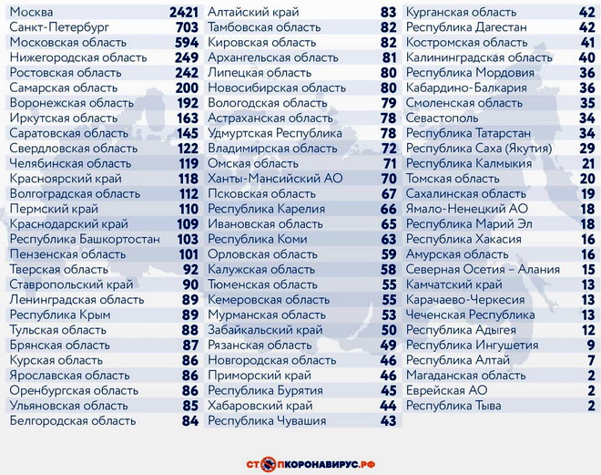 Среди субъектов Федерации по числу заболевших за сутки лидируют Санкт-Петербург (703 случая), Московская область (594), Нижегородская область (249), Ростовская область (242), Самарская область (200), Воронежская область (192), Иркутская область (163).