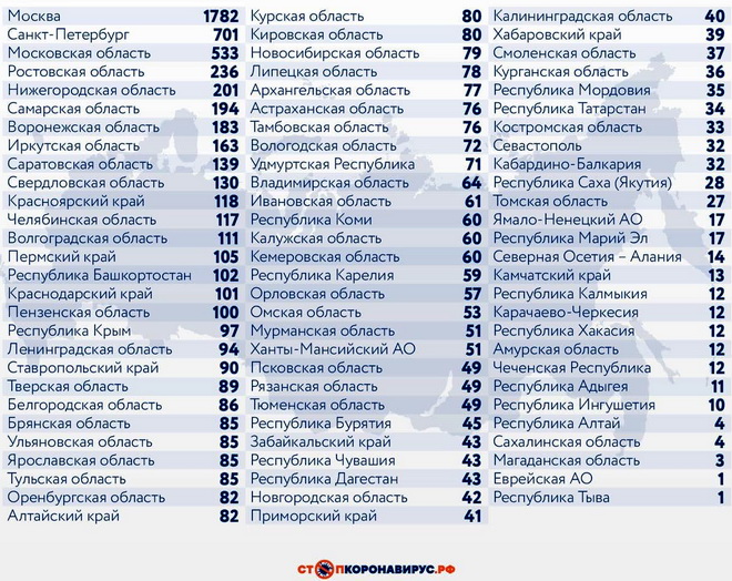 Кроме Москвы, среди субъектов Федерации по числу заболевших за последние сутки выделяются Санкт-Петербург (701 случай), Московская область (533), Ростовская область (236), Нижегородская область (201), Самарская область (194), Воронежская область (183), Иркутская область (163).