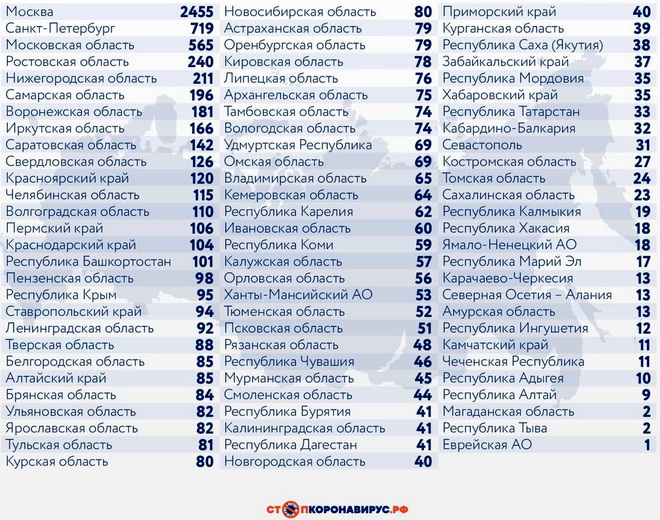 Кроме Москвы, среди субъектов Федерации по числу заболевших за последние 24 часа выделяются Санкт-Петербург (719 случаев), Московская область (565), Ростовская область (240), Нижегородская область (211), Самарская область (196), Воронежская область (181), Иркутская область (166).