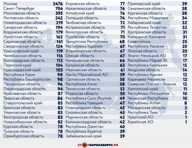 Помимо Москвы, из субъектов Федерации по числу заболевших за последние сутки выделяются Санкт-Петербург (704 случая), Московская область (595), Ростовская область (242), Нижегородская область (219), Самарская область (194), Воронежская область (179), Иркутская область (162).