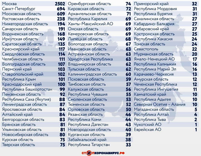 Из других субъектов Федерации по числу заболевших за последние сутки выделяются Санкт-Петербург (694 случая), Московская область (609), Ростовская область (238), Нижегородская область (194), Самарская область (191), Воронежская область (168), Иркутская область (149).