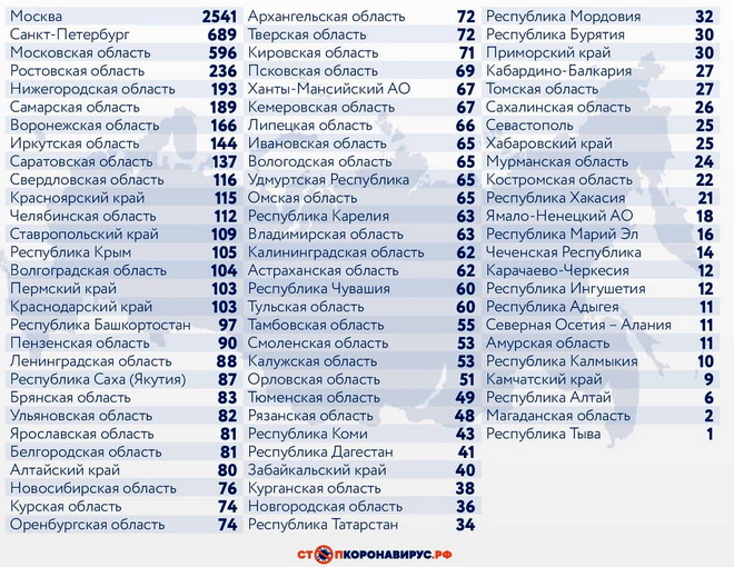 Среди других субъектов Федерации по числу заболевших за истекшие сутки выделяются Санкт-Петербург (689 случаев), Московская область (596), Ростовская область (236), Нижегородская область (193), Самарская область (189), Воронежская область (166), Иркутская область (144).