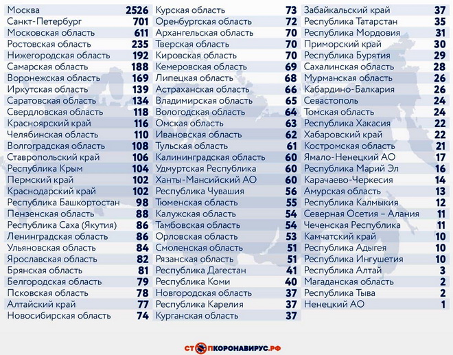 Из других субъектов Федерации по числу заболевших за истекшие 24 часа выделяются Санкт-Петербург (701 случай), Московская область (611), Ростовская область (235), Нижегородская область (192), Самарская область (188), Воронежская область (169).