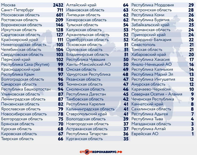 Из других субъектов Федерации по числу случаев заражения за последние 24 часа выделяются Санкт-Петербург (711 случаев), Московская область (601), Ростовская область (209), Воронежская область (146), Иркутская область (128), Саратовская область (127).