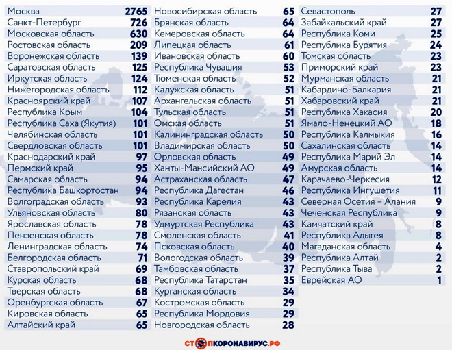 По числу случаев заражения за истекшие 24 часа из других субъектов Федерации можно особо выделить Санкт-Петербург (726 случаев), Московскую область (630), Ростовскую область (208), Воронежскую область (139), Саратовскую область (125), Иркутскую область (124).