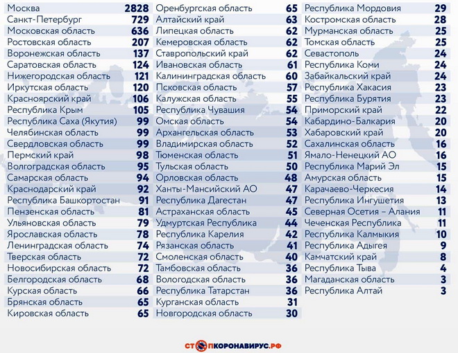 Среди других субъектов Федерации в лидерах по числу случаев заражения остаются Санкт-Петербург (729 случаев за сутки), Московская область (636), Ростовская область (207), Воронежская область (137), Саратовская область (124), Иркутская область (120).