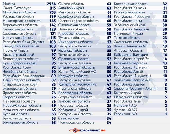 Среди других субъектов Федерации по количеству случаев заражения за истекшие сутки выделяются Санкт-Петербург (815), Московская область (753), Ростовская область (199), Нижегородская область (145), Воронежская область (142), Самарская область (129), Саратовская область (121), Иркутская область (115).