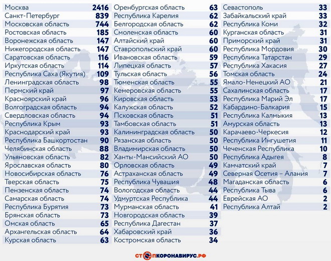 Среди других субъектов Федерации по количеству случаев заражения за последние сутки лидируют Санкт-Петербург (839), Московская область (744), Ростовская область (185), Воронежская область (147), Нижегородская область (147), Саратовская область (116), Иркутская область (114).