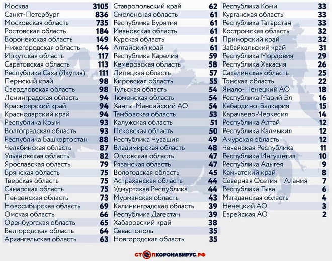 Среди других субъектов Федерации по количеству случаев заражения за последние сутки выделяются Санкт-Петербург (836), Московская область (735), Ростовская область (184), Воронежская область (149), Нижегородская область (144), Иркутская область (117), Саратовская область (113).