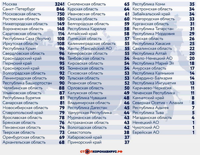 Лидерами среди других субъектов Федерации по количеству случаев заражения за последние сутки являются Санкт-Петербург (846), Московская область (750), Ростовская область (180), Нижегородская область (149), Воронежская область (148), Саратовская область (114).