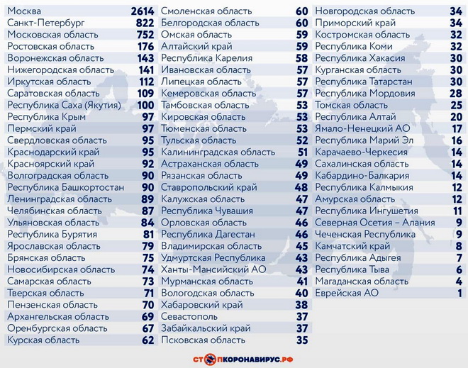 Среди других субъектов Федерации по количеству случаев заражения за последние сутки выделяются Санкт-Петербург (822), Московская область (752), Ростовская область (176), Воронежская область (143), Нижегородская область (141), Иркутская область (112), Саратовская область (109).