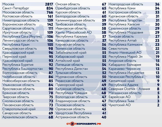 Среди других субъектов Федерации по числу случаев заражения за истекшие 24 часа выделяются Санкт-Петербург (834), Московская область (766), Ростовская область (161), Нижегородская область (159), Воронежская область (142), Саратовская область (111), Иркутская область (109).