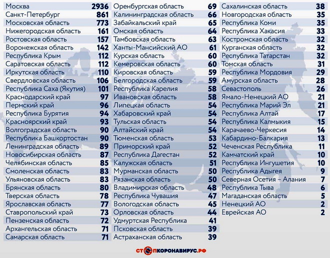 Среди прочих субъектов Федерации по числу случаев заражения за последние сутки выделяются Санкт-Петербург (861), Московская область (773), Нижегородская область (161), Ростовская область (157), Воронежская область (142), Саратовская область (112), республика Крым (112), Иркутская область (110).