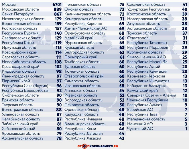 Из других субъектов Федерации по числу случаев заражения за истекшие 24 часа выделяются Санкт-Петербург (889), Московская область (867), Нижегородская область (179), Воронежская область (159), Ростовская область (157), Республика Бурятия (140), Свердловская область (129), Республика Крым (119), Иркутская область (115).
