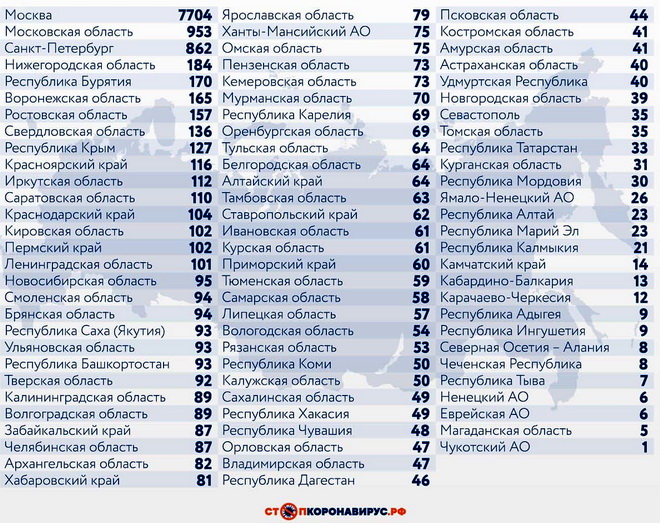 Среди других субъектов Федерации по числу случаев заражения за последние сутки выделяются Московская область (953), Санкт-Петербург (862), Нижегородская область (184), Республика Бурятия (170), Воронежская область (165), Ростовская область (157), Свердловская область (136), Республика Крым (127).