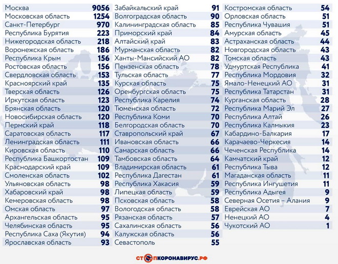 Из других субъектов Федерации по числу случаев заражения за последние сутки выделяются Московская область (1254), Санкт-Петербург (970), Республика Бурятия (223), Нижегородская область (218), Воронежская область (186), Ростовская область (156), Республика Крым (156), Свердловская область (153), Красноярский край (135).