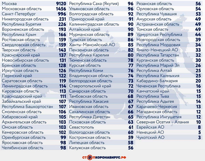 Среди других субъектов Федерации по числу случаев заражения за последние сутки выделяются Московская область (1456), Санкт-Петербург (996), Нижегородская область (231), Республика Бурятия (226), Воронежская область (193), Республика Крым (166), Ростовская область (159), Свердловская область (159).