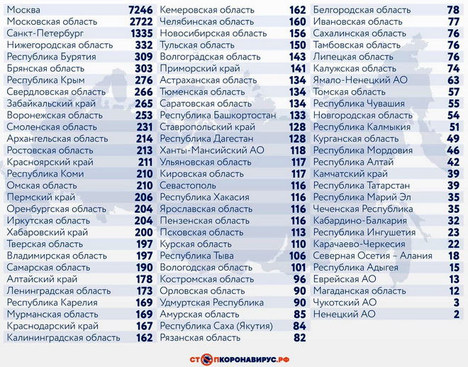 Среди других субъектов Федерации по числу случаев заражения за сутки выделяются Московская область (2722), Санкт-Петербург (1335), Нижегородская область (332), Республика Бурятия (309), Брянская область (303), Республика Крым (276), Свердловская область (266), Забайкальский край (265), Воронежская область (253).
