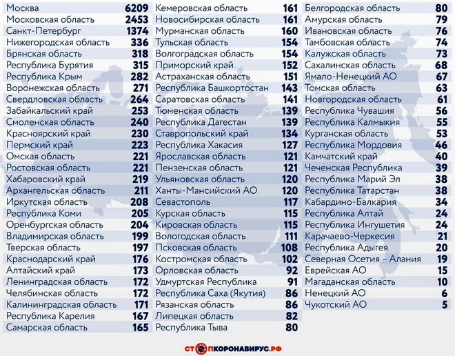Из других субъектов Федерации по числу случаев заражения за сутки выделяются Московская область (2453), Санкт-Петербург (1374), Нижегородская область (336), Брянская область (318), Республика Бурятия (315), Республика Крым (282), Воронежская область (271), Свердловская область (264), Забайкальский край (253).
