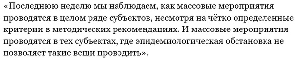 Возмущение Анны Поповой также вызывают массовые политические мероприятия, которые проходят в закрытых помещениях без масок и соблюдения дистанции: