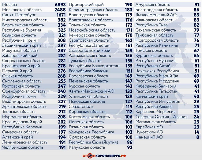 Из других субъектов Федерации по числу случаев заражения за сутки выделяются Московская область (2488), Санкт-Петербург (1671), Нижегородская область (382), Воронежская область (334), Республика Бурятия (325), Брянская область (321), Республика Крым (308).