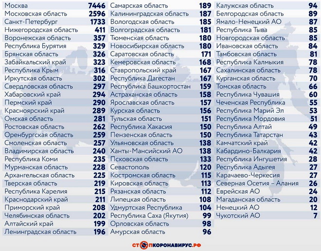 Среди других субъектов Федерации по числу случаев заражения за сутки выделяются Московская область (2596), Санкт-Петербург (1733), Нижегородская область (411), Воронежская область (357), Республика Бурятия (329), Брянская область (326), Забайкальский край (323), Республика Крым (316).