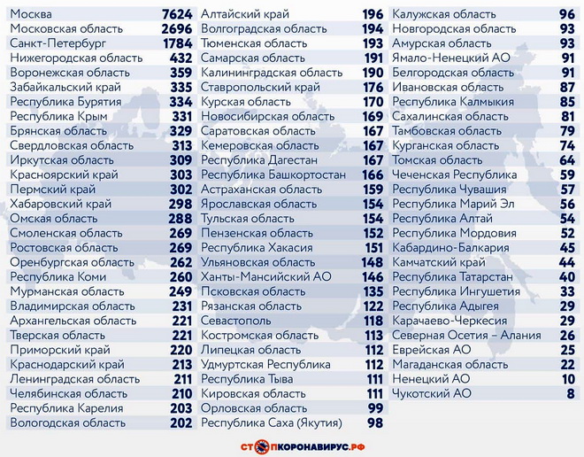 Из других субъектов Федерации по числу случаев заражения за 24 часа выделяются Московская область (2696), Санкт-Петербург (1784), Нижегородская область (432), Воронежская область (359), Забайкальский край (335), Республика Бурятия (334), Республика Крым (331), Брянская область (329).