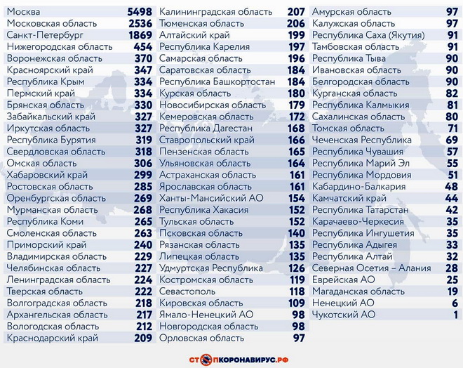 Субъекты Федерации – лидеры по числу случаев заражения за последние 24 часа: Московская область (2536), Санкт-Петербург (1869), Нижегородская область (454), Воронежская область (370), Красноярский край (347), Республика Крым (334), Пермский край (334), Брянская область (330), Забайкальский край (327).