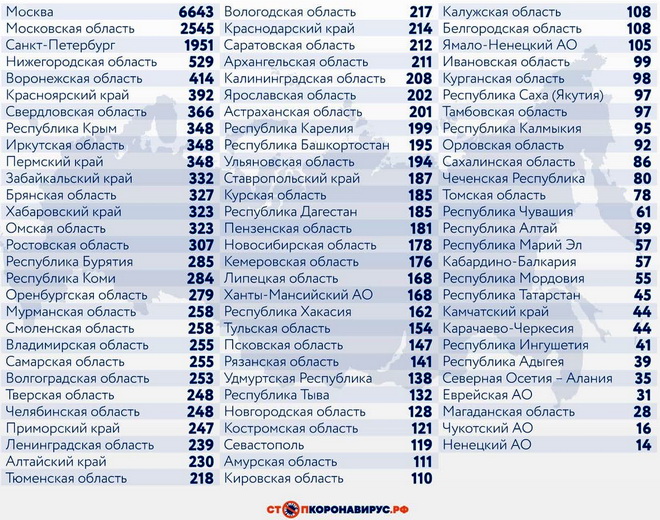 Среди других субъектов Федерации по числу случаев заражения за последние сутки выделяются Московская область (2545), Санкт-Петербург (1951), Нижегородская область (529), Воронежская область (414), Красноярский край (392), Свердловская область (366), Республика Крым (348), Иркутская область (348), Пермский край (348), Забайкальский край (332), Брянская область (327).