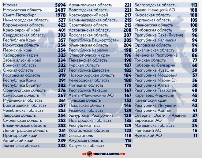 Среди других субъектов Федерации по числу случаев заражения за последние сутки выделяются Московская область (2487), Санкт-Петербург (1978), Нижегородская область (527), Воронежская область (423), Красноярский край (401), Свердловская область (393), Республика Крым (357), Иркутская область (354), Пермский край (354).