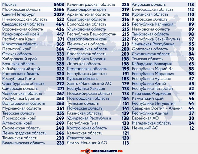 Из других субъектов Федерации по числу случаев заражения за последние сутки выделяются Московская область (2566), Санкт-Петербург (2029), Нижегородская область (522), Свердловская область (464), Воронежская область (426), Красноярский край (417), Республика Крым (371), Иркутская область (365), Пермский край (364), Омская область (333).