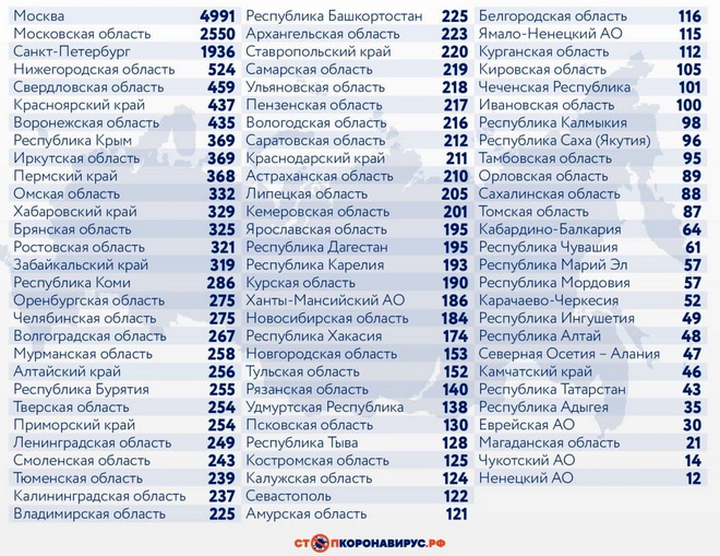 Среди других субъектов Федерации по числу случаев заражения за последние 24 часа выделяются Московская область (2550), Санкт-Петербург (1936), Нижегородская область (524), Свердловская область (439), Красноярский край (437), Воронежская область (435), Республика Крым (369), Иркутская область (369), Пермский край (368), Омская область (332).
