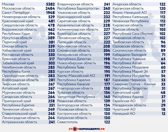 Из других субъектов Федерации по числу случаев заражения за последние 24 часа выделяются Московская область (2484), Санкт-Петербург (1948), Нижегородская область (529), Красноярский край (481) Свердловская область (478), Воронежская область (462), Республика Крым (394), Иркутская область (389), Пермский край (381), Омская область (339).