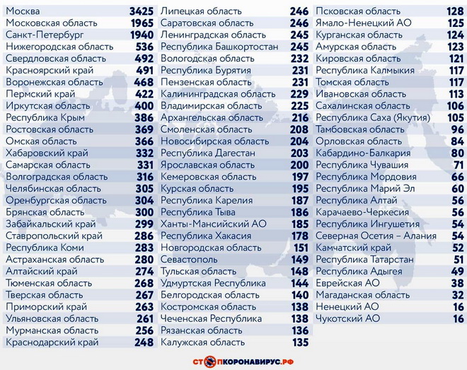 Среди других субъектов Федерации по числу случаев заражения за истекшие сутки выделяются Московская область (1965), Санкт-Петербург (1940), Нижегородская область (536), Свердловская область (492), Красноярский край (491), Воронежская область (468), Пермский край (422), Иркутская область (400), Республика Крым (386), Ростовская область (369).