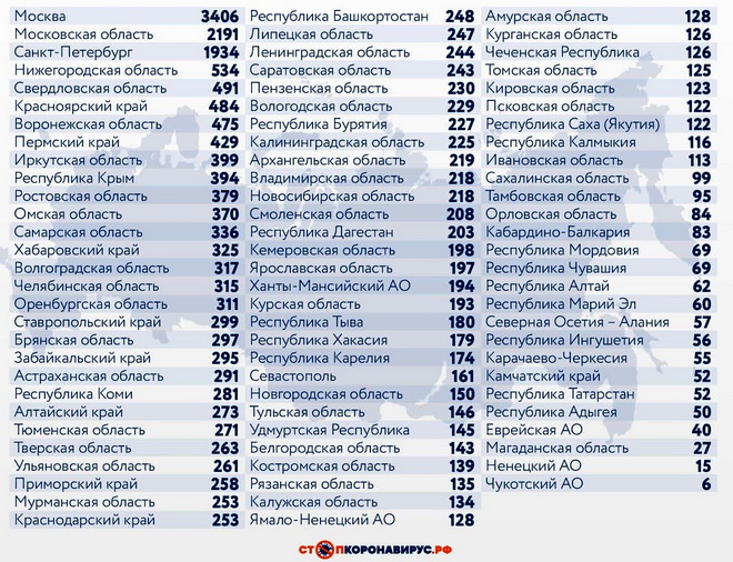 Среди иных субъектов Федерации по числу случаев заражения за истекшие 24 часа выделяются Московская область (2191), Санкт-Петербург (1934), Нижегородская область (534), Свердловская область (491), Красноярский край (484), Воронежская область (475), Пермский край (429), Иркутская область (399), Республика Крым (394), Ростовская область (379).