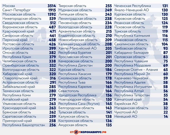 Из других субъектов Федерации по числу случаев заражения за последние 24 часа выделяются Санкт-Петербург (1915), Московская область (1592), Нижегородская область (539), Свердловская область (512), Воронежская область (487), Красноярский край (471), Самарская область (461), Пермский край (458), Ростовская область (426), Иркутская область (399).