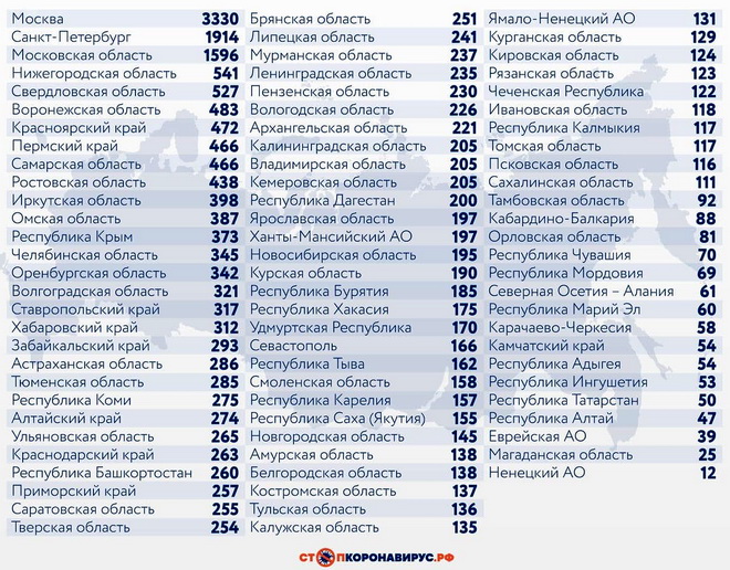 Среди иных субъектов Федерации по числу случаев заражения за последние сутки выделяются Санкт-Петербург (1914), Московская область (1596), Нижегородская область (541), Свердловская область (527), Воронежская область (483), Красноярский край (472), Пермский край (466), Самарская область (466), Ростовская область (438), Иркутская область (398).
