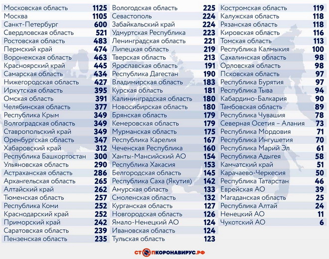 Из других субъектов Федерации по числу случаев заражения выделяются Московская область (1125), Санкт-Петербург (600), Свердловская область (521), Ростовская область (483), Пермский край (474), Воронежская область (463).