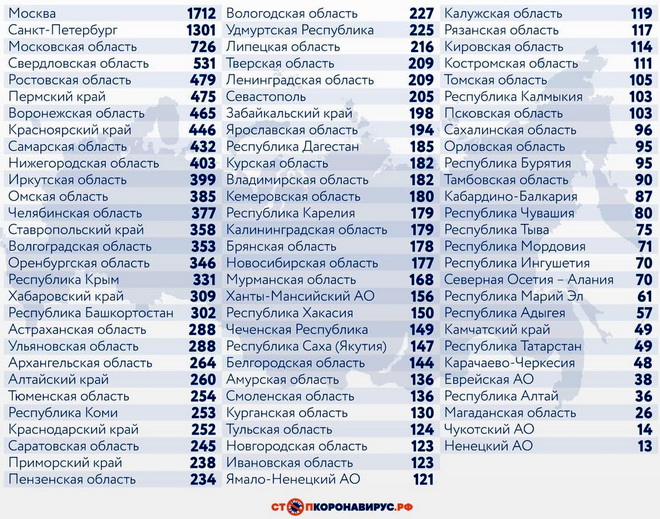 Из других субъектов Федерации по числу случаев заражения выделяются Санкт-Петербург (1301), Московская область (726), Свердловская область (531), Ростовская область (479), Пермский край (475), Воронежская область (465).