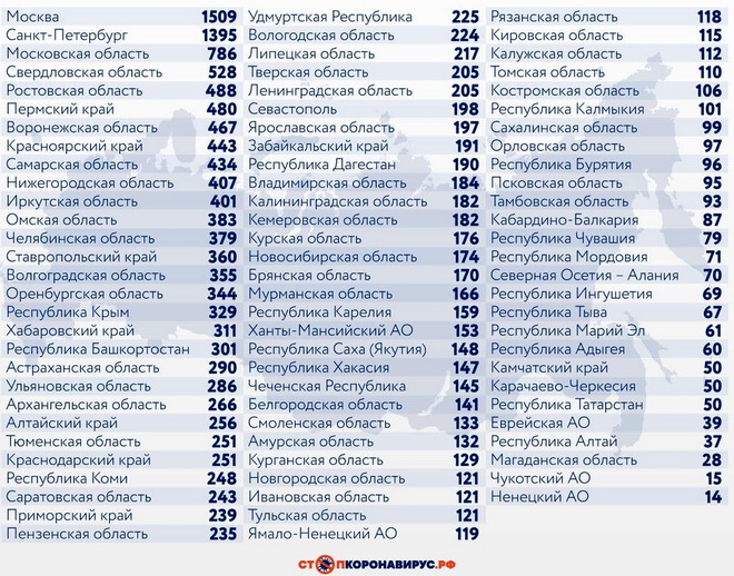 Среди других субъектов Федерации по числу случаев заражения за последние сутки выделяются Санкт-Петербург (1395), Московская область (786), Свердловская область (528), Ростовская область (488), Пермский край (480), Воронежская область (467).