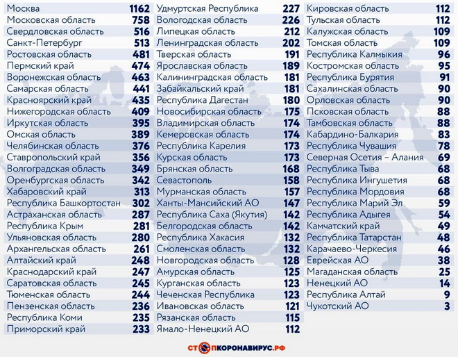 Среди других субъектов Федерации по числу случаев заражения за последние сутки выделяются Московская область (758), Свердловская область (516), Санкт-Петербург (513), Ростовская область (481), Пермский край (474), Воронежская область (463), Самарская область (441).