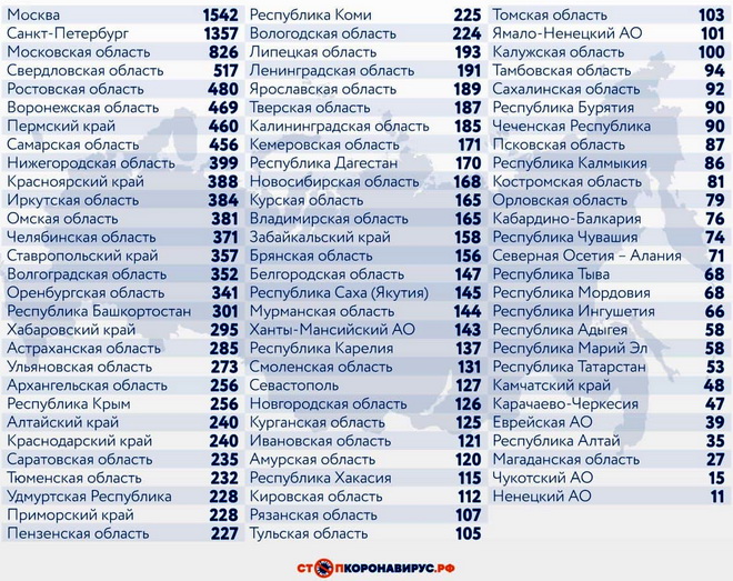 Среди других субъектов Федерации по числу случаев заражения ковидом за последние сутки выделяются Санкт-Петербург (1357), Московская область (826), Свердловская область (517), Ростовская область (480), Воронежская область (469), Пермский край (460), Самарская область (456).