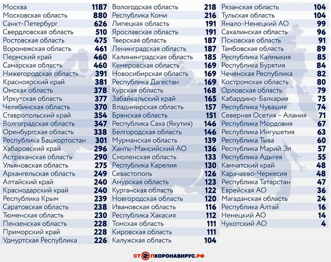 Среди прочих субъектов Федерации по числу случаев заражения ковидом за истекшие сутки выделяются Московская область (880), Санкт-Петербург (626), Свердловская область (510), Ростовская область (475), Воронежская область (461), Пермский край (460), Самарская область (460).