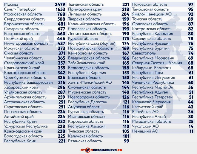 Из других субъектов Федерации по числу случаев заражения за последние сутки выделяются Санкт-Петербург (1653), Московская область (768), Свердловская область (508), Воронежская область (481), Самарская область (477), Ростовская область (460), Пермский край (446), Нижегородская область (437).