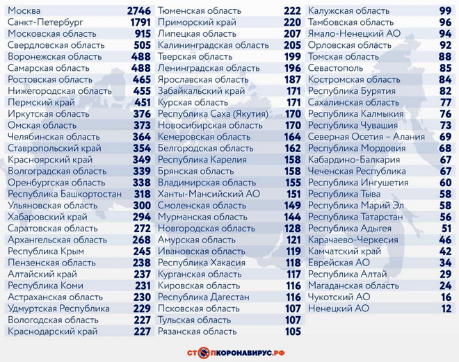 Из других субъектов Федерации по числу случаев заражения за последние сутки выделяются Санкт-Петербург (1791), Московская область (915), Свердловская область (505), Воронежская область (488), Самарская область (488), Ростовская область (465), Нижегородская область (455), Пермский край (451).