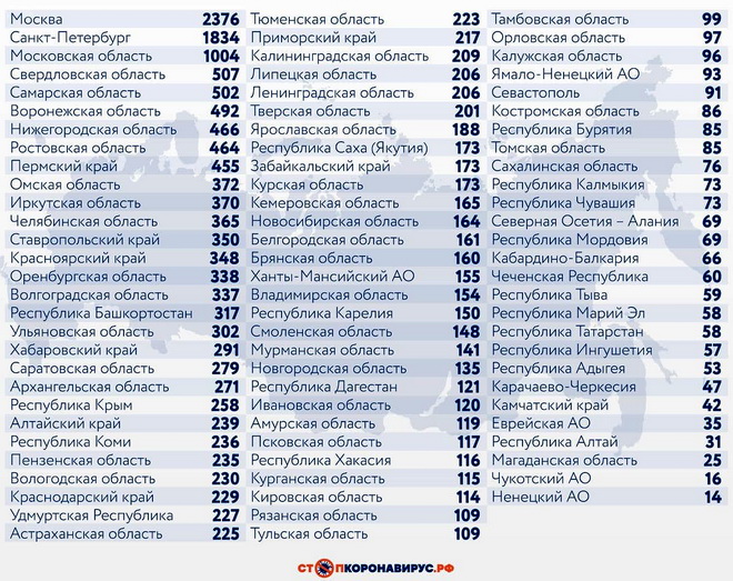 Среди прочих субъектов Федерации по числу случаев заражения за последние 24 часа выделяются Санкт-Петербург (1834), Московская область (1004), Свердловская область (507), Самарская область (502), Воронежская область (492), Нижегородская область (466), Ростовская область (464), Пермский край (455).