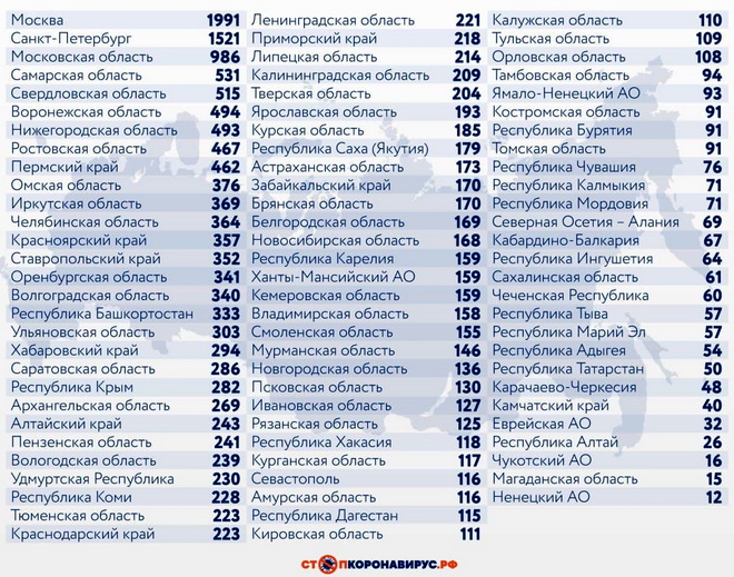 Из других субъектов Федерации по числу случаев заражения за последние 24 часа выделяются Санкт-Петербург (1521), Московская область (986), Самарская область (531), Свердловская область (515), Воронежская область (494), Нижегородская область (493), Ростовская область (467), Пермский край (462).