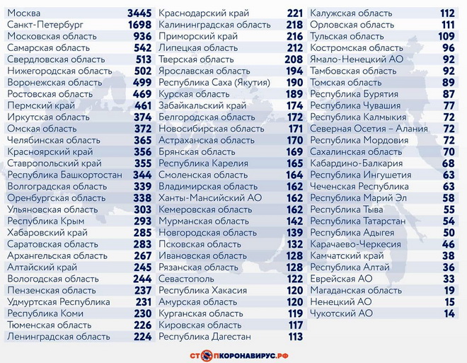 Среди других субъектов Федерации по числу случаев заражения за последние 24 часа выделяются Санкт-Петербург (1698), Московская область (936), Самарская область (542), Свердловская область (513), Нижегородская область (502), Воронежская область (499), Ростовская область (469), Пермский край (461).